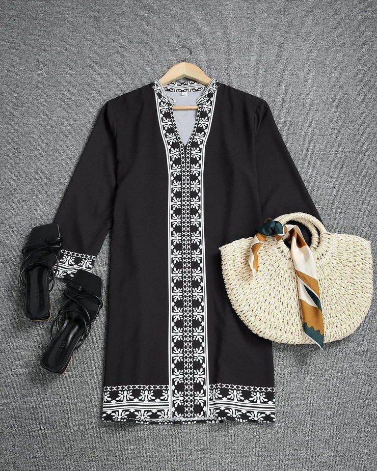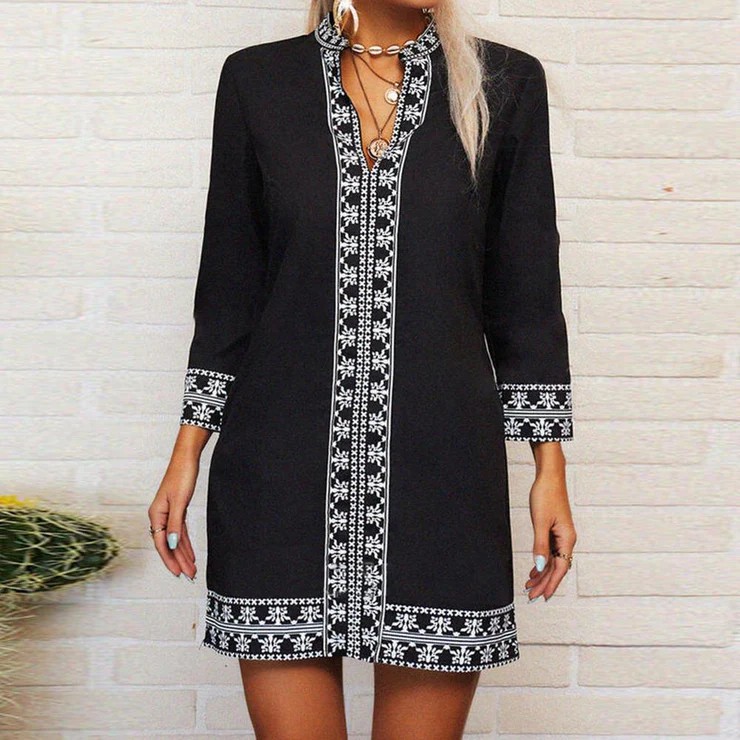 This sleek mini dress features wrist-length long sleeves with a flared fit on the bottom for a boho-chic vibe. A decorative pattern down the front, on the sleeves, and open collar give this fitted dress a flattering fit, perfect for dressing up or down. Wear this classic shift dress out to lunch, shopping, on a date, or work event.  Neckline: V-neck; Sleeve Length: Long Sleeve; Dress Length: Mini; Pattern Type: Print; Silhouette: Shift; 40% Elastane, 60% Rayon; Machine Washable; Relaxed Fit.