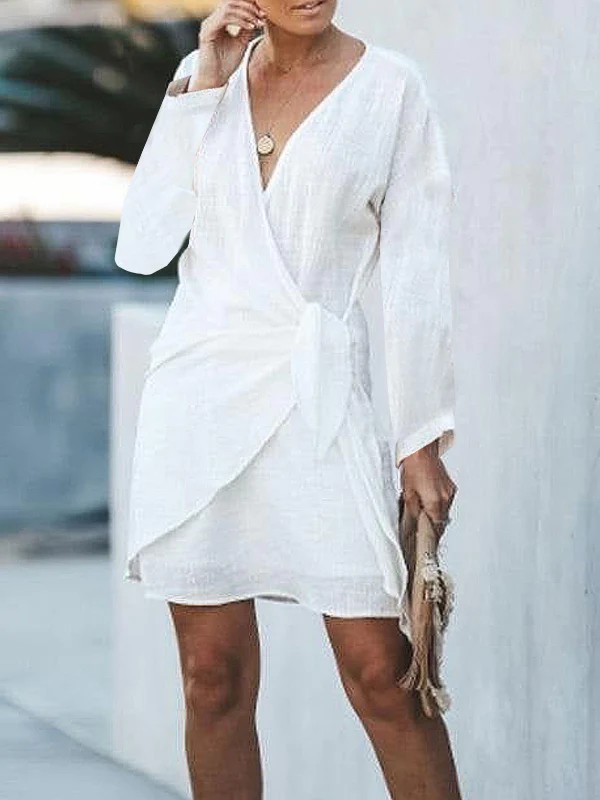 • White Long Sleeved Tie Side Wrap Summer Mini Dress