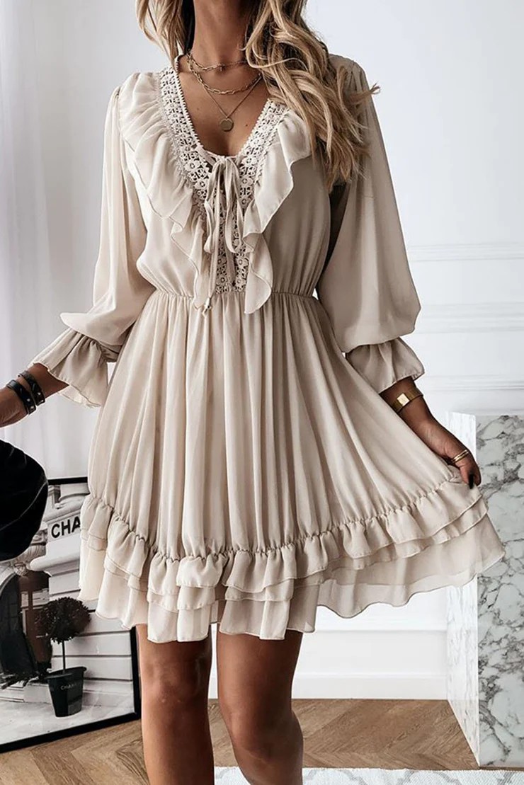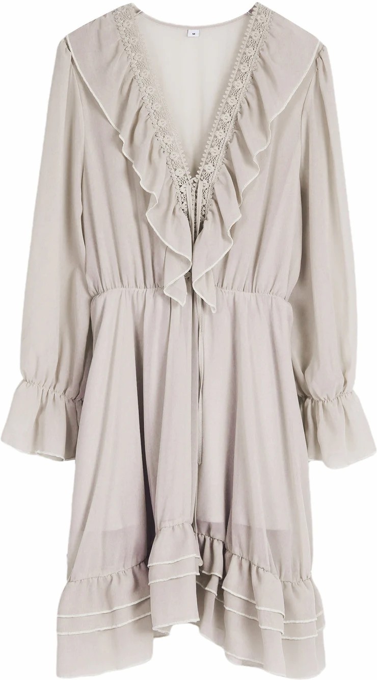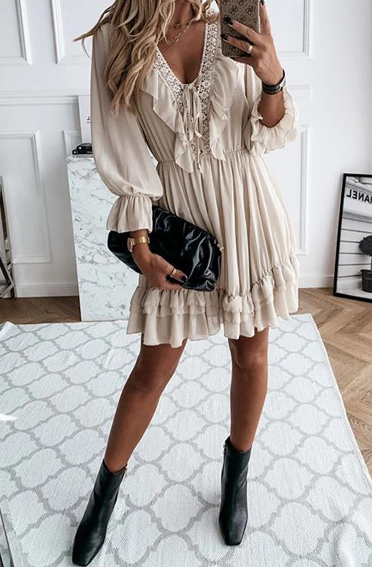 Neckline: V-neck; Sleeve Length: Long Sleeve; Dress Length: Mini; Pattern Type: Plain; Silhouette: A-line; 40% Elastane, 60% Rayon; Machine Washable.