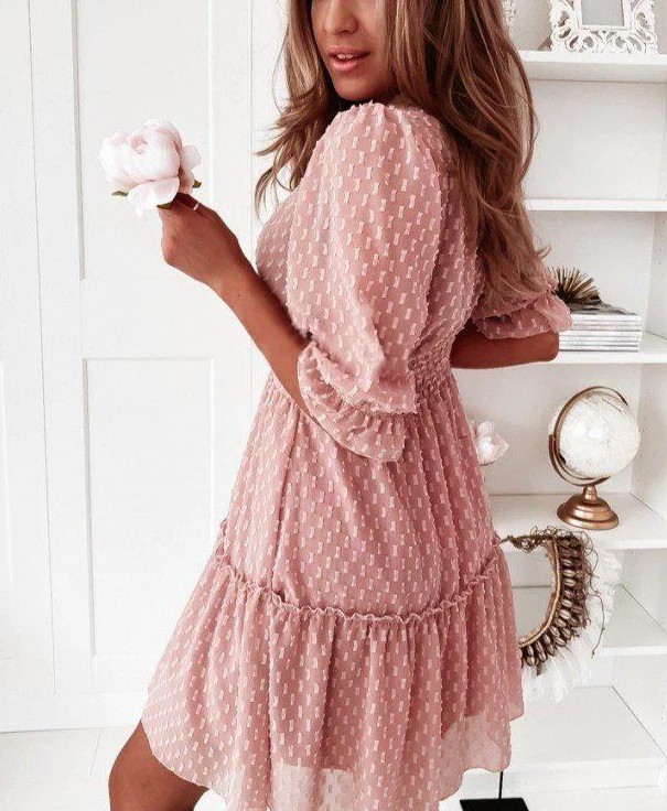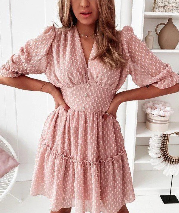 Neckline: V-neck; Sleeve Length: Half Sleeve; Dress Length: Mini; Pattern Type: Print; Silhouette: A-line; 40% Elastane, 60% Rayon; Machine Washable.