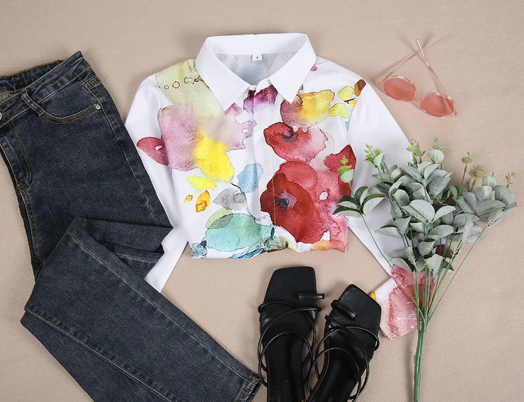Sunny shades of yellow and orange are reminiscent of fresh citrus, making this white fold-over collar blouse pop. Greens and blues elevate the watercolor style pattern, making this three-quarter length sleeve top easy to mix and match with different pants, leggings, or jeans. Layering necklaces, hoops, and a purse complement the gorgeous print. Wash in gentle or delicate cycle with light colors. Keep away from dark colors. Collared; Sleeve Length: 3/4 Sleeve; Pattern Type: Print; 65% Cotton, 35% Elastane; Machine Washable.