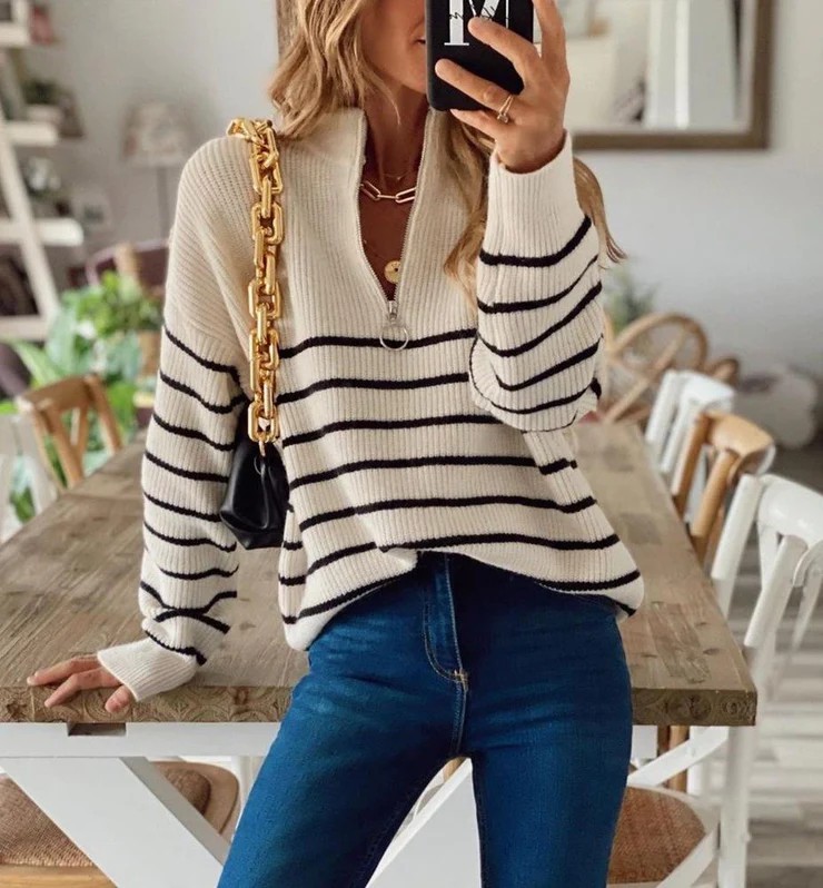 You need casual, and this top is going to do it.  With a fun zipper that you can open and close to just the right neckline, this lightweight pullover is going to be both simple and casually dressy which is just right for those days out with the girls.  The causal ribbed style is also a great little detail for something extra! Neckline: Zipper V-neck; Sleeve Length: Long Sleeve; Striped Print; Shift Silhouette; Slightly Stretchy; Relaxed Fit; Hand Wash Cold or Dry Clean.