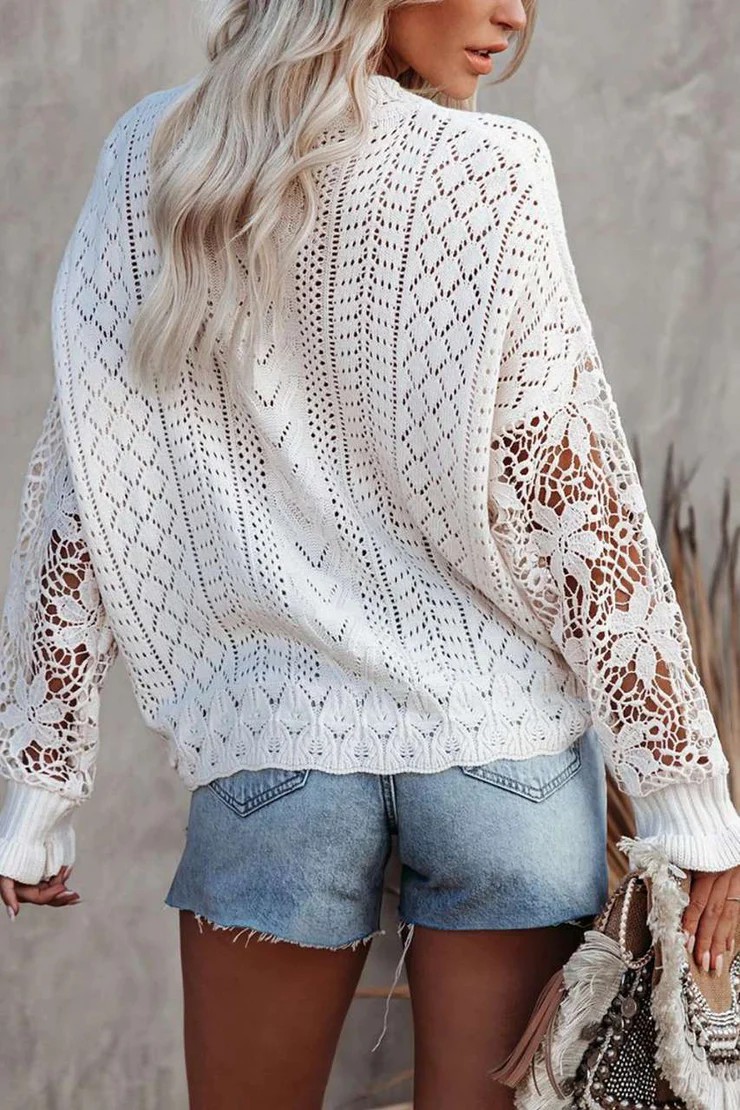 Sweaters don't get prettier than this. Dreamy, feminine, romantic, this cream-colored sweater is patterned with a modern pointelle design and lacy sleeves with ruffled cuffs. Styled with drop shoulders, the sweater has an easy, slouchy fit so you can wear alone or layered. Neckline: Round Neck; Sleeve Length: Long Sleeve; Pattern Type: Plain; Machine Washable; Cotton/Acrylic; Relaxed Fit.