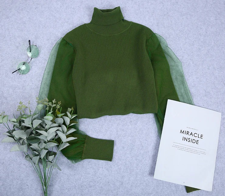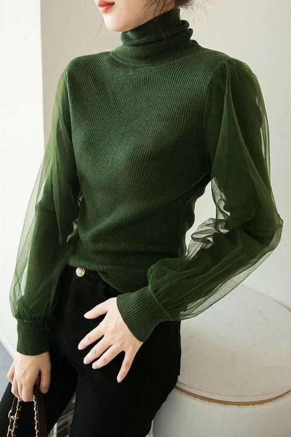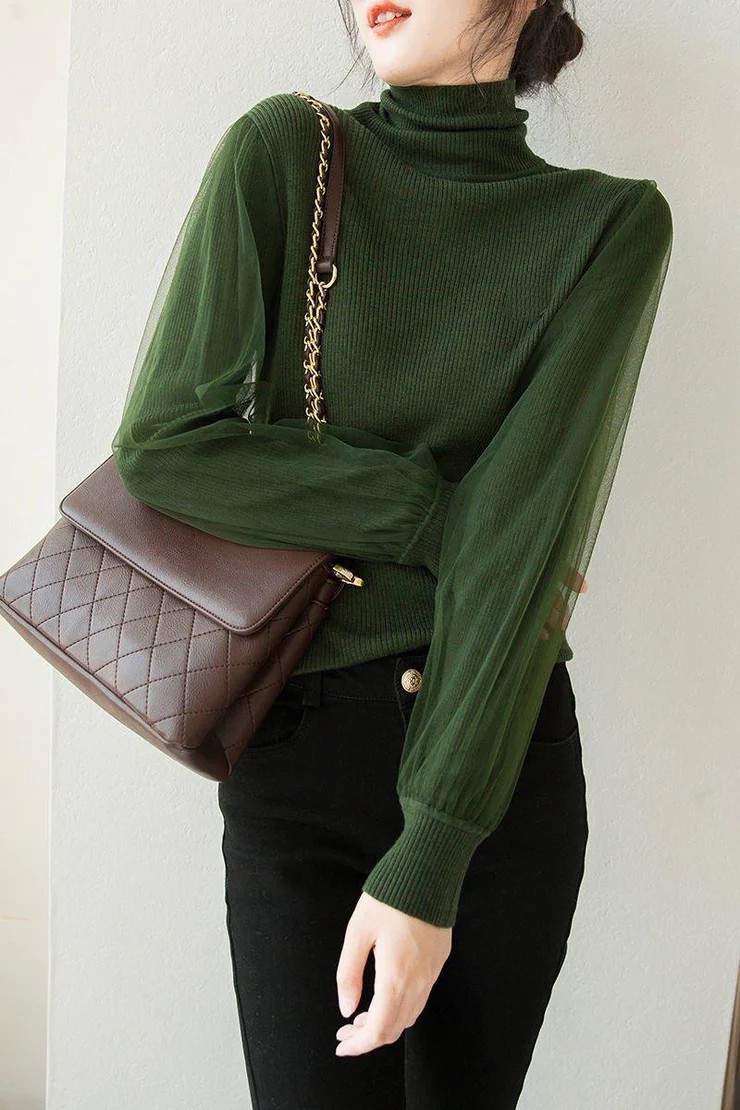 • Green Turtleneck Double Layer Sheer Long Sleeves Sweater