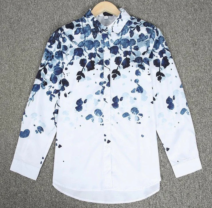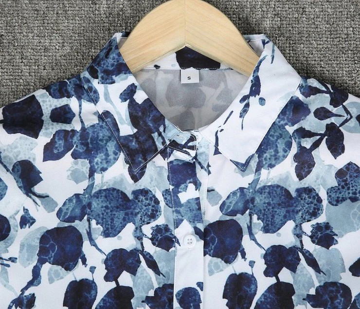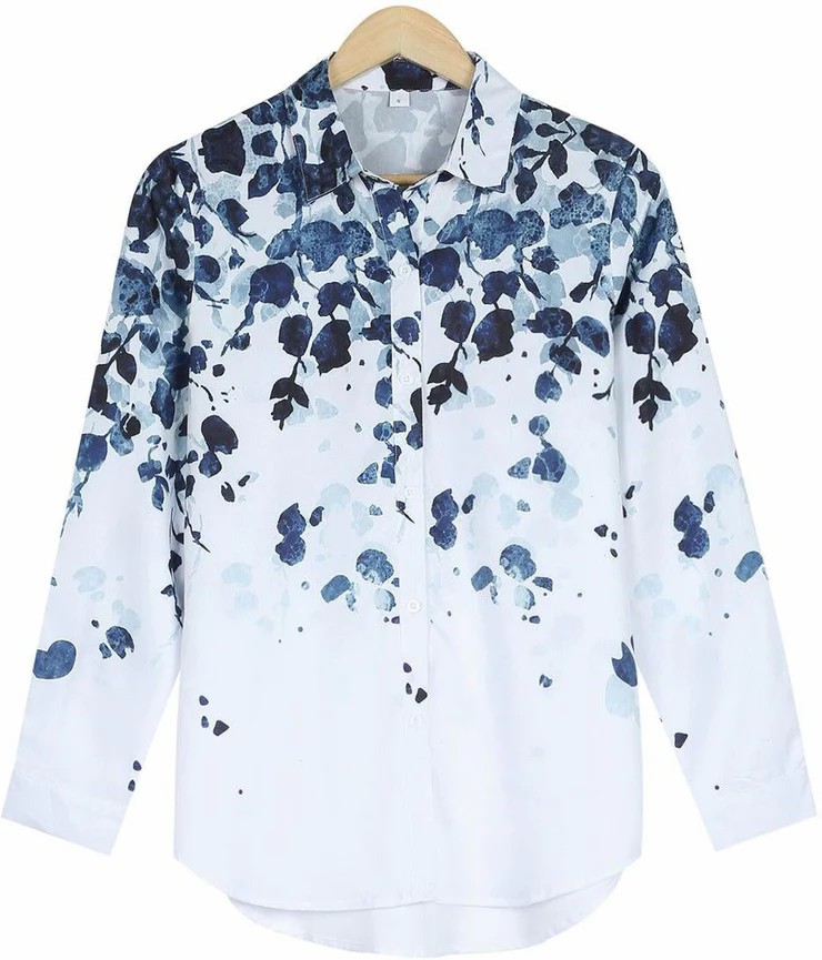 A white button-up blouse is a wardrobe superhero. But it’s the beautiful blue petal print that takes this polished top to the next level. Styled with a crisp collar and extended shirttail hem, this creative top is a quality classic—but so much better. Pair it with slim-leg pants and a quilted purse. eckline: Collared; eeve Length: Long Sleeve; Pattern Type: Print; Silhouette: Shift; Front Button Details; 40% Elastane, 60% Rayon; Machine Washable; Relaxed Fit.