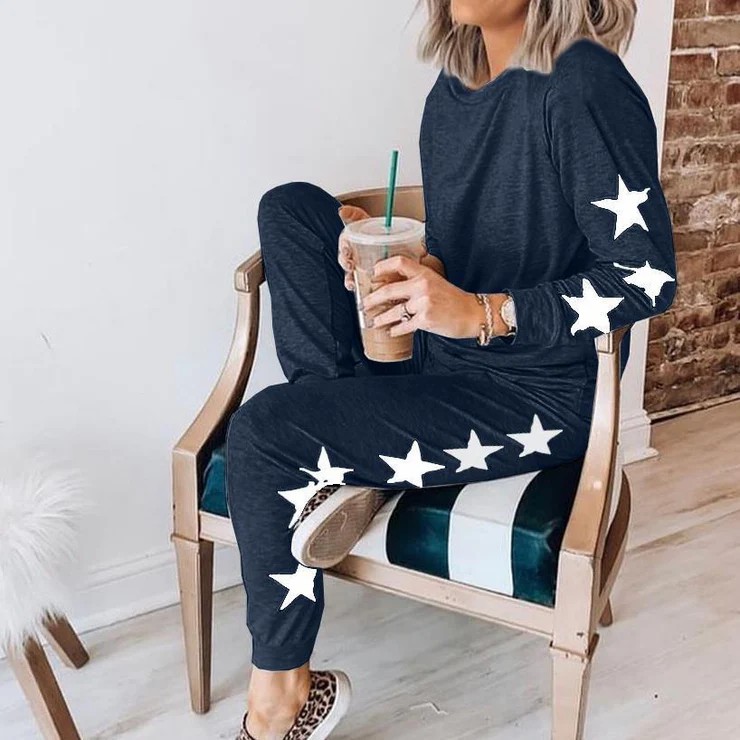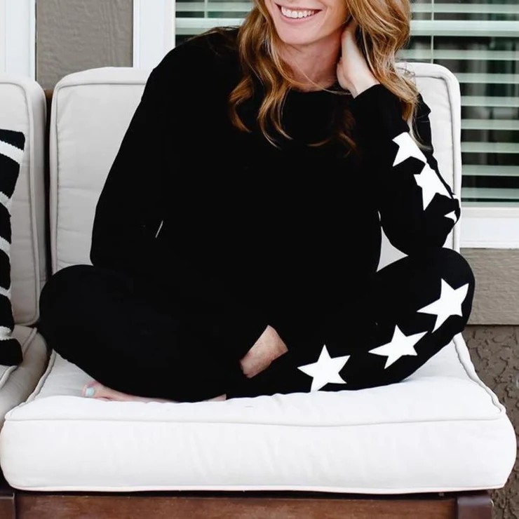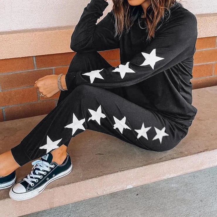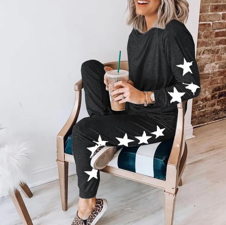 And the award for top style star goes to…you! Feel good, look adorable in this soft set including a lightweight sweatshirt and joggers. Designed with a round neckline, the top can also be snipped for a relaxed 80s fit. Minimally styled to work year-round for at-home lounging, a coffee run or a library study sesh, the dark top and pants are perked up with large stars down one sleeve and leg. Pattern Type: Geometric; Sleeve Type: Long Sleeve; Neckline: Crew Neck, One Shoulder; Occasion: Daytime, Going out; Process: Printed; Style: Casual, Statement; 40% Elastane, 60% Cotton; Machine Washable.