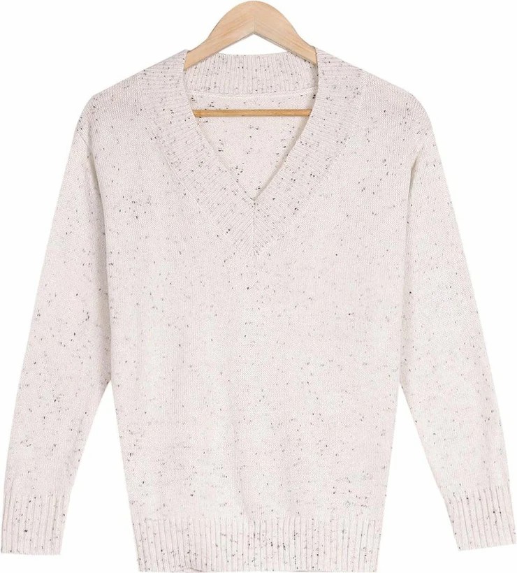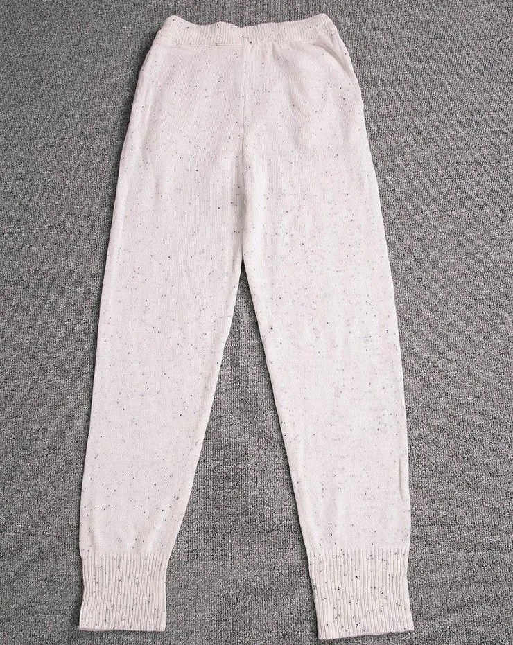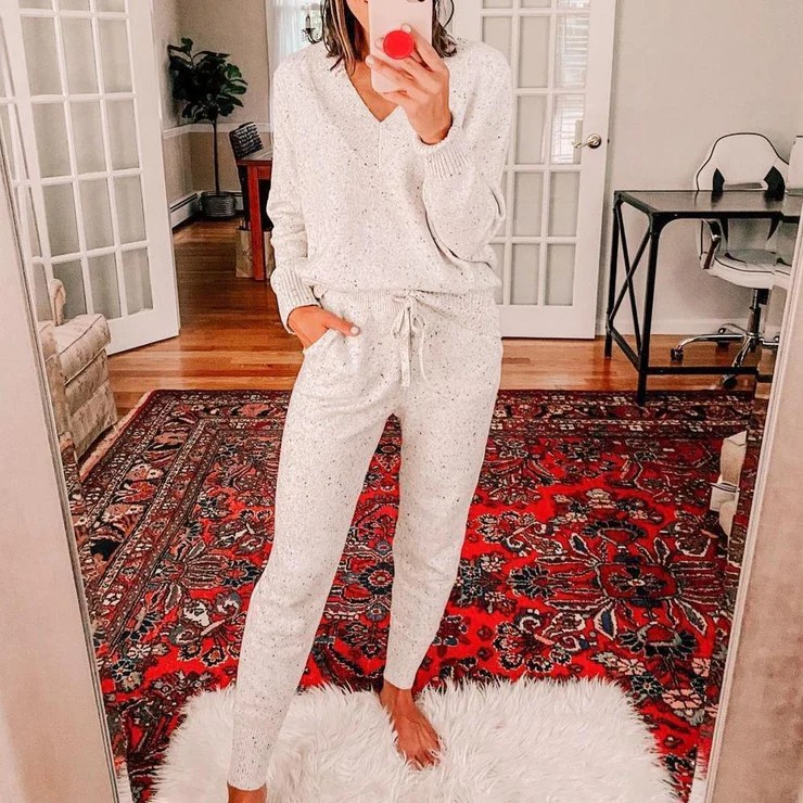 A super cute pullover and matching set? Count us in! Get in the spirit of cold weather and cups of cocoa with this matching set you can wear out and about or to bed. This pale grey set has a speckled pattern with ribbed banding on the top and pant cuffs. The warm pullover is designed with a prominent V-neckline and the soft pants have a pull-on waist and cozy pockets. Long Sleeve with Elastic Hem; Plain; V-Neckline; Elasticized Drawstring Waist; Slightly Stretchy; Hand Wash Cold.